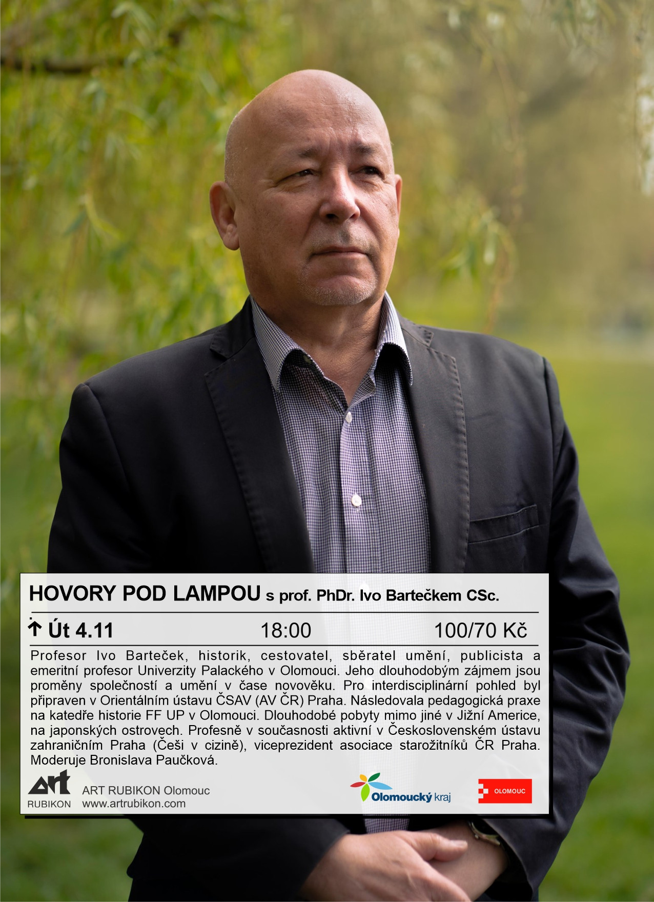 Do našeho stálého pořadu zveme profesora Ivo Bartečka, historika, cestovatele, sběratele umění, publicistu a emeritního profesora Univerzity Palackého v Olomouci. Jeho dlouhodobým zájmem jsou proměny společností (civilizací) a umění v čase novověku. Pro interdisciplinární pohled byl připraven v Orientálním ústavu ČSAV (AV ČR) Praha. Následovala pedagogická praxe na katedře historie FF UP v Olomouci. Dlouhodobé pobyty mimo jiné v Jižní Americe, na japonských ostrovech. Profesně v současnosti aktivní v Československém ústavu zahraničním Praha (Češi v cizině), viceprezident Asociace starožitníků ČR Praha. Autor knižních titulů .
